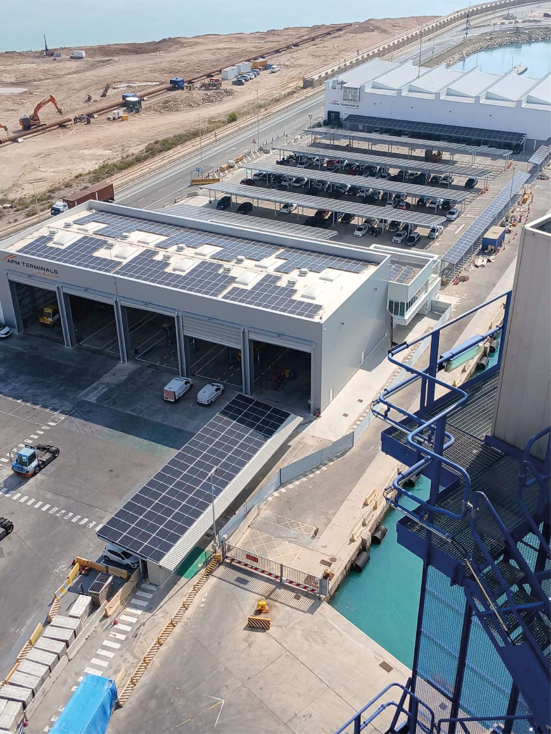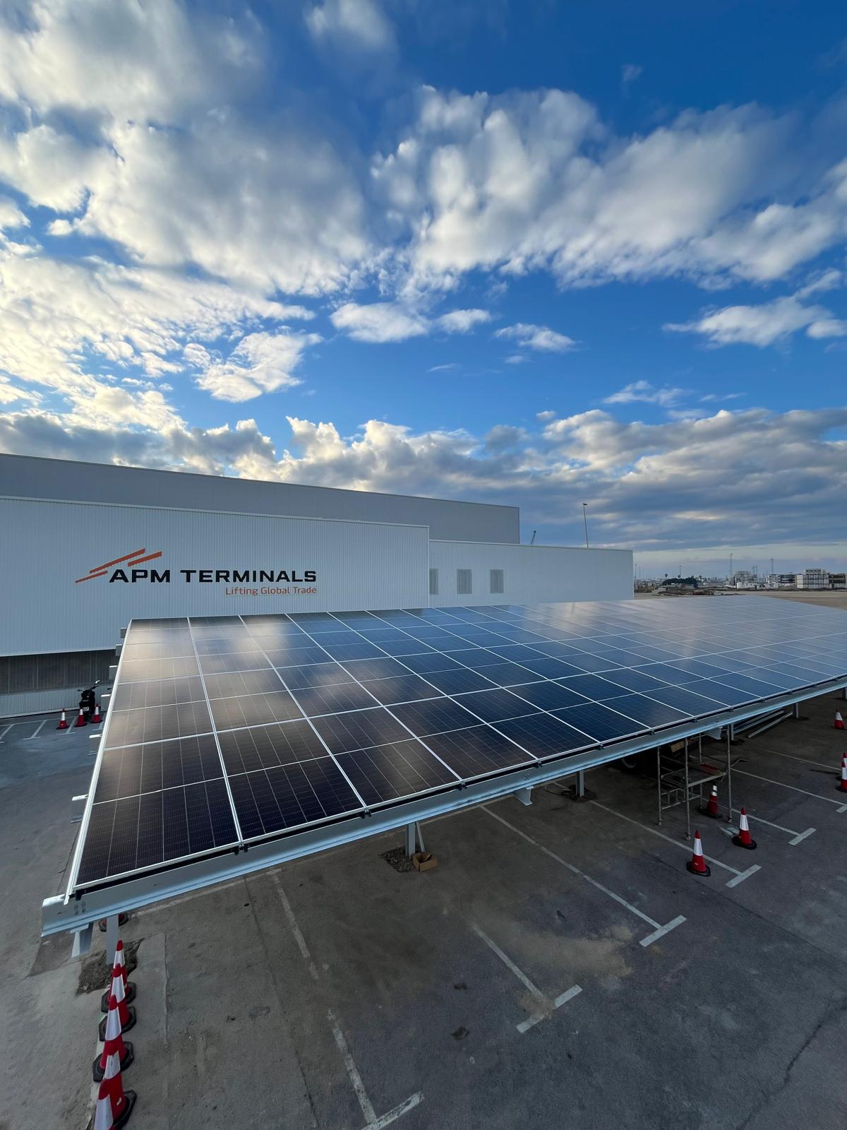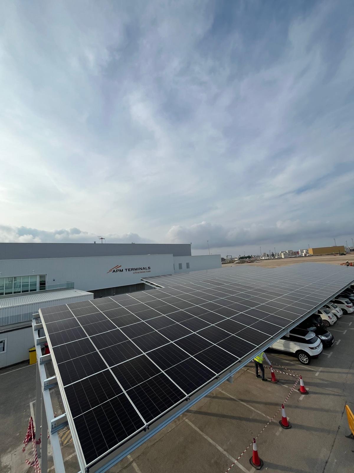 Se ha realizado la instalación de un sistema fotovoltaico en las marquesinas del parking y en las oficinas en las grúas de APM en el puerto de Valencia, con el objetivo de reducir el consumo energético y garantizar una integración eficiente en estas instalaciones industriales y portuarias.