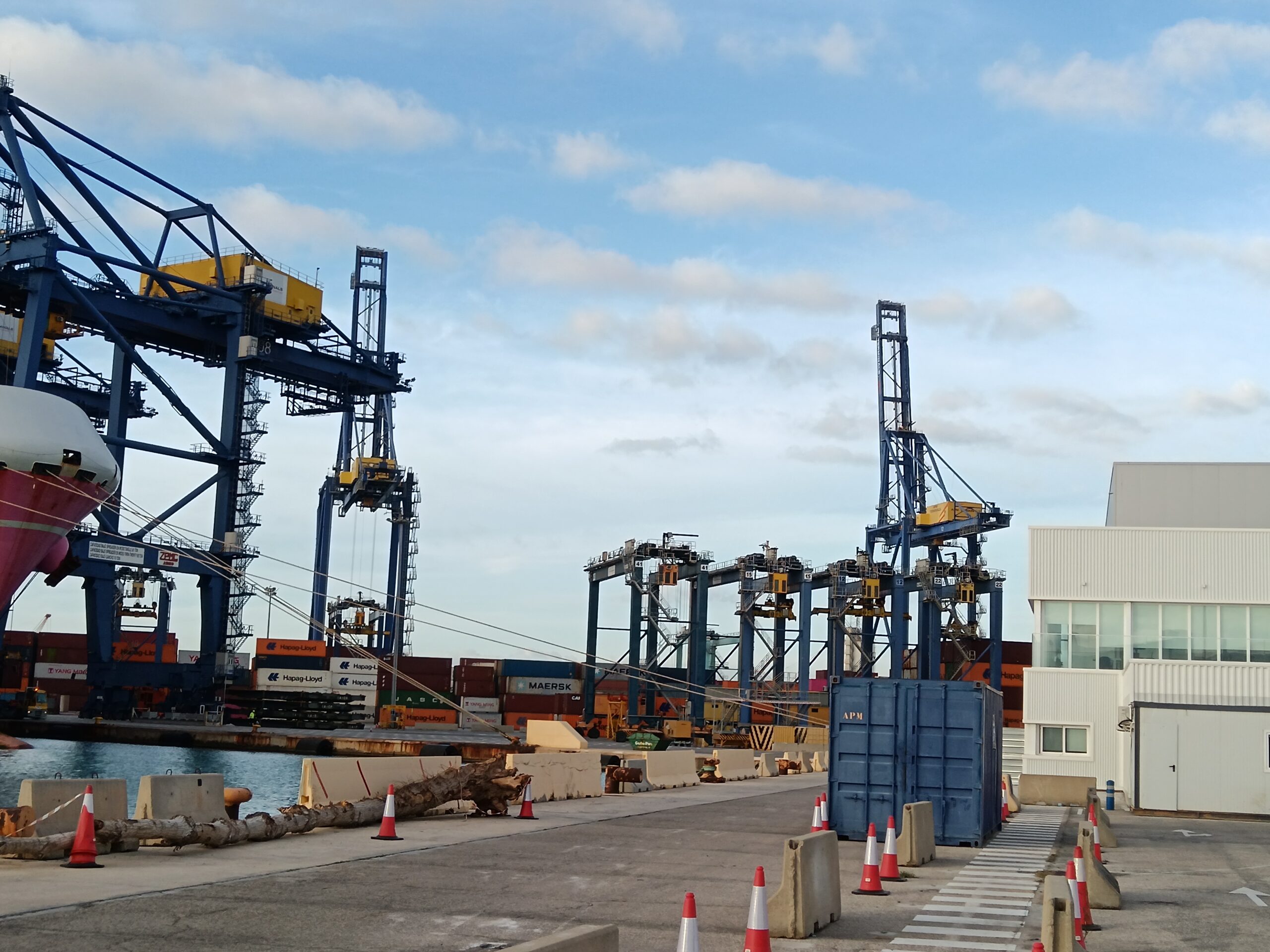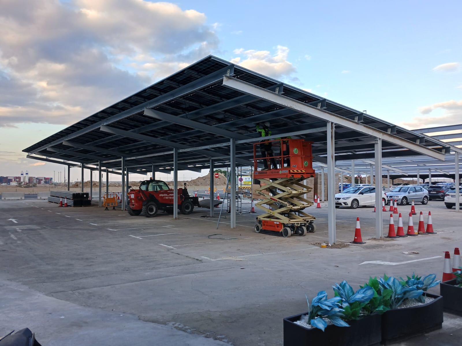 Instalación Fotovoltaica en las oficinas de APM en el Puerto de Valencia. Instalación en Marquesinas del parking así como en las oficinas situadas en lo alto de sus gruas.